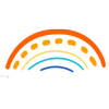 Group of six smiling children against a blue background with colorful geometric shapes and a rainbow arc design.